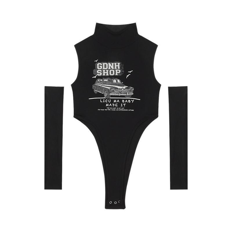 y2k printed high collar black sleeves one piece small suspender belt