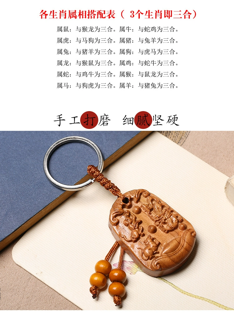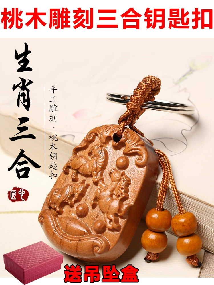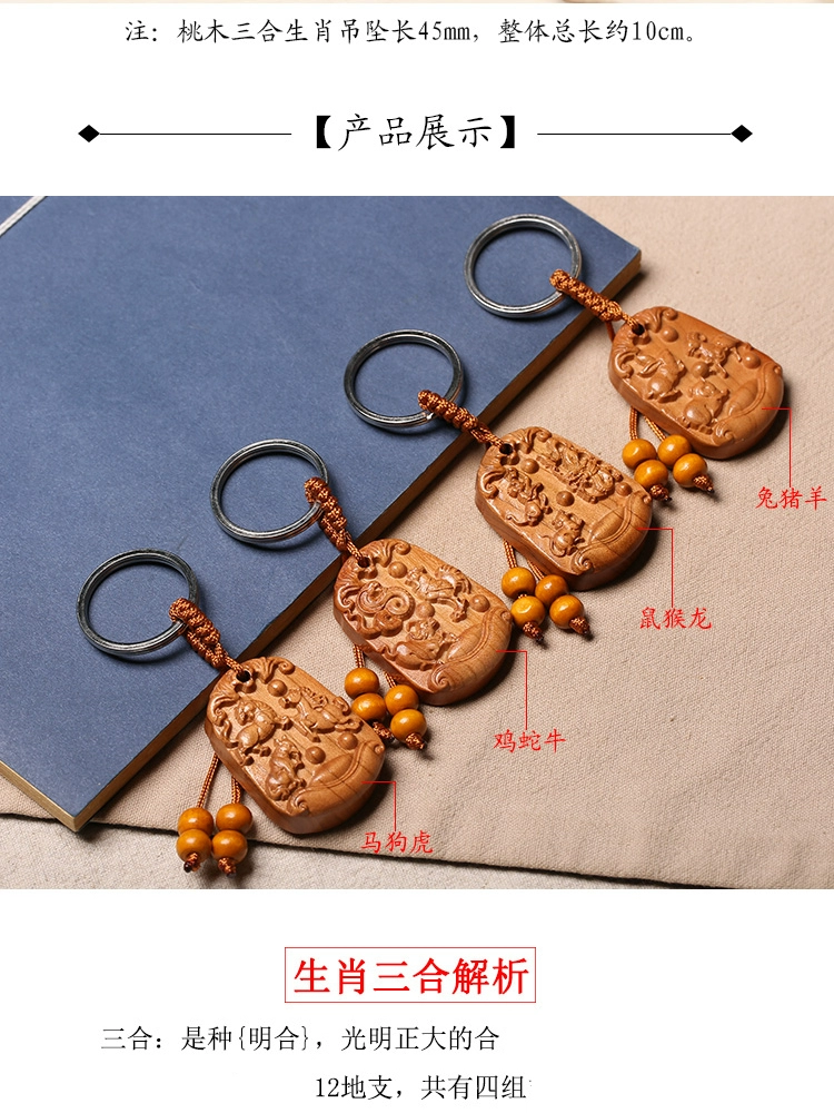 Year of the Dragon Peach Wood Car Pendant Zodiac Rat Ox Tiger Rabbit Snake Horse Monkey Rooster Dog Three-in-Six Pendant Keychain Pig Sheep Gift