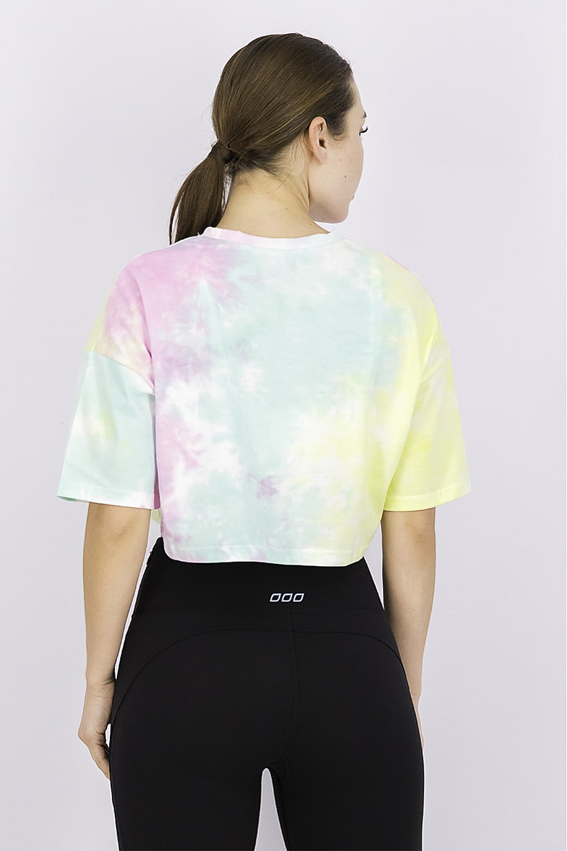 This product is easy to care for as it is machine washable. It has a sportswear fit and is available in international sizes. The fabric is light and suitable for outdoor sports. Please note that the product color may appear slightly different due to lighting or monitor settings. The top is made of 80% cotton and 20% polyester, with a tie-dye pattern and print. It belongs to the yellow color family and is categorized as sportswear.