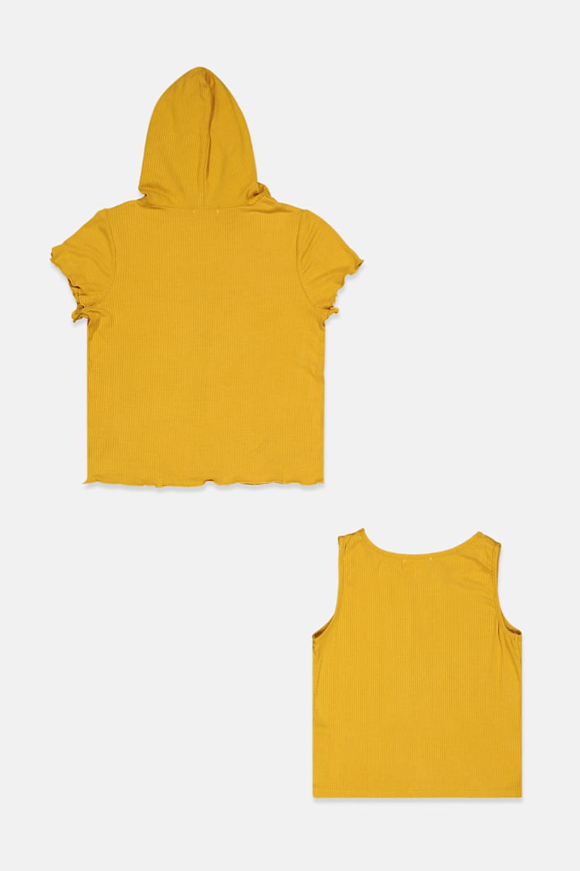 | descriptionOriginal | Care : Machine washable, Ideal For : Girls, Sleeve Length : Short Sleeve, Types of Hem : Lettuce hem, Types of Neckline & Collar : Hood, Types of Sleeve : Short sleeve, Disclaimer : Product color may slightly vary due to photographic lighting sources or your monitor settings., Fabrics : 95% Rayon, 5% Spandex, Occasion : Casual, Pattern & Print : Tie dye, Textured pattern, Types of Closures : Zipper closure, Pullover, Color Family : Yellow, |