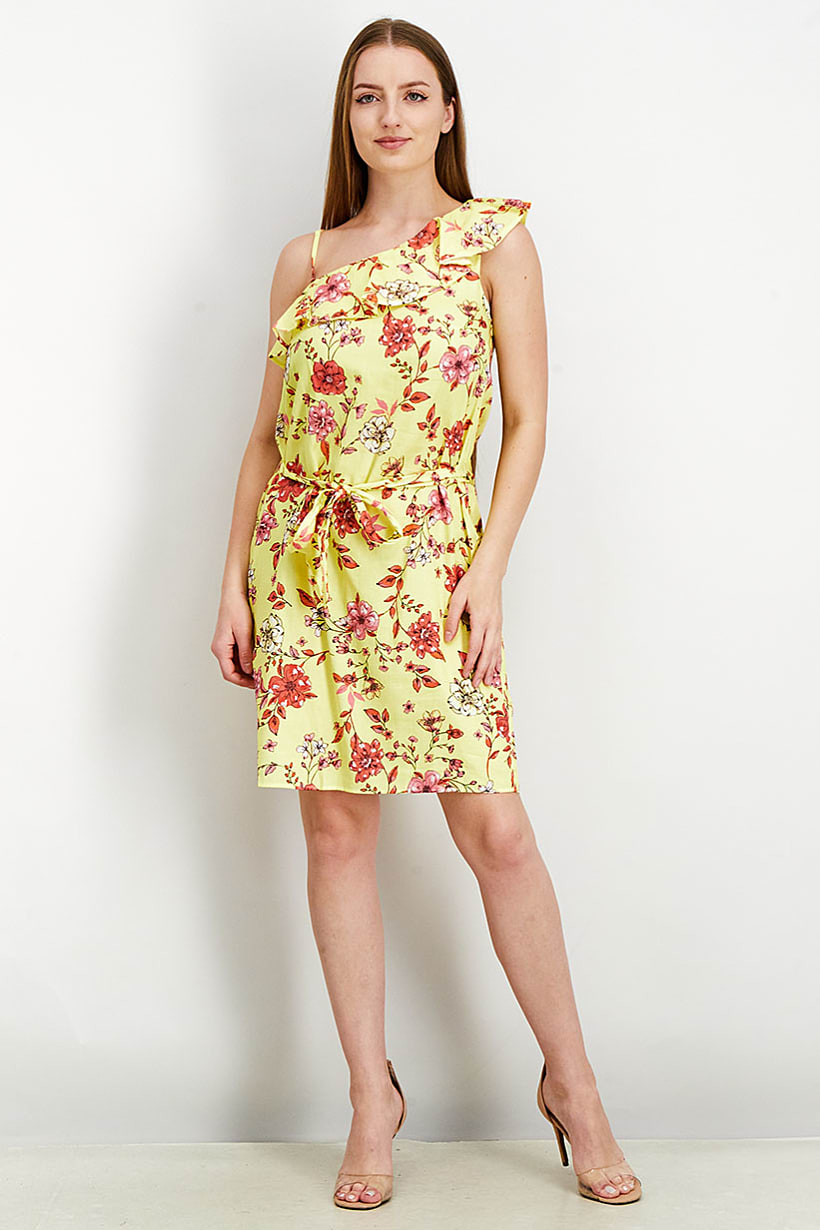 Women Clothing, Dresses, women asymmetric neckline floral printed belted tie dress yellow combo