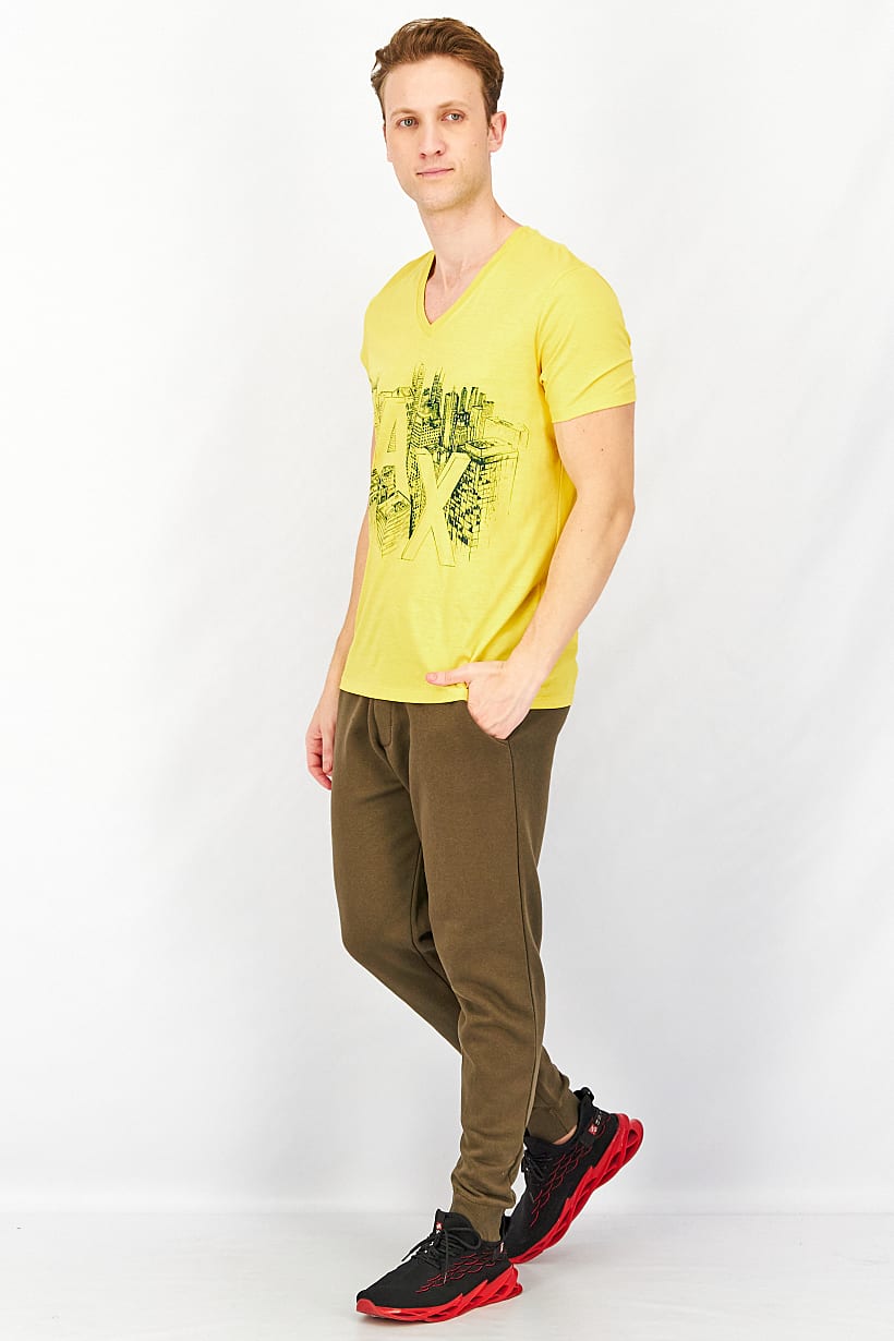 Care : Machine washable, Ideal For : Men, Size shown : International, Sleeve Length : Short Sleeve, T-Shirt Style : V- Neck, Types of Hem : Straight hem, Types of Neckline & Collar : V-neckline, Types of Sleeve : Short sleeve, Disclaimer : Product color may slightly vary due to photographic lighting sources or your monitor settings., Fabrics : 100% Pima Cotton, Occasion : Casual, Pattern & Print : Graphic print, Types of Closures : Pullover, Color Family : Yellow, Fit : Slim fit,