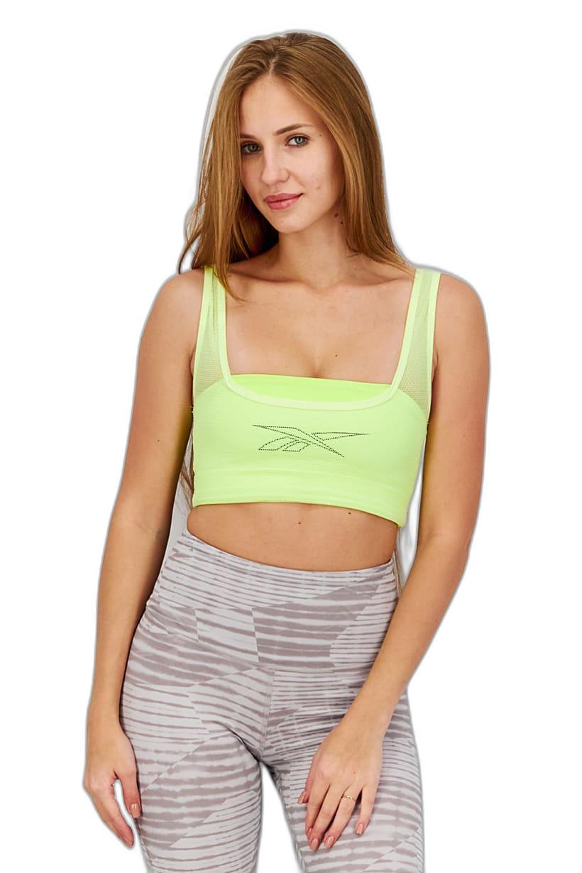 Care : Machine washable, Fit : Sportswear Fit, Ideal For : Women, Size shown : International, Sleeve Length : Sleeveless, Thickness : Light, Type of Sport : Training, Types of Hem : Straight hem, Types of Neckline & Collar : Scoop neckline, Types of Sleeve : Sleeveless, Disclaimer : Product color may slightly vary due to photographic lighting sources or your monitor settings., Fabrics : 85% Polyester, 15% Spandex, Occasion : Sport, Pattern & Print : Brand Logo, Sportswear Type : Sports Bra, Types of Closures : Pullover, Color Family : Lime Green,