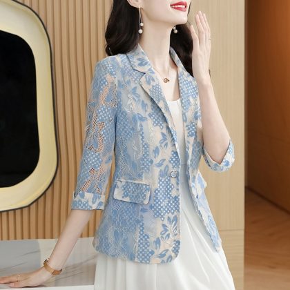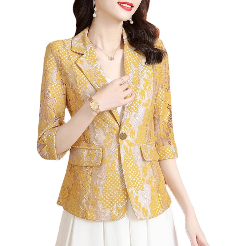 | nameOriginal | Yellow lace small suit jacket women's thin summer Small fashionable temperament three-quarter sleeve hollow-out suit top |
