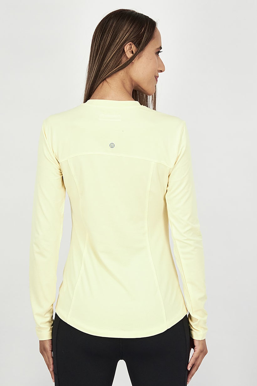 This women’s sportswear top is machine washable and has a sporty fit. It is ideal for training and features a crew neckline and long sleeves with a straight hem. The top is made of 91% polyester and 9% spandex, with a textured pattern in a light yellow color. Please note that the product color may vary slightly due to lighting or monitor settings. The top is a pullover style and has a light thickness, making it perfect for active wear. The size shown is international.