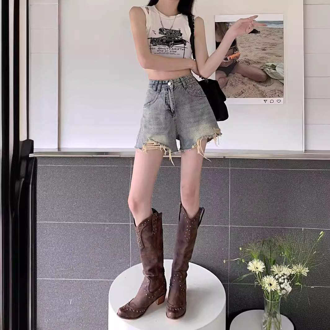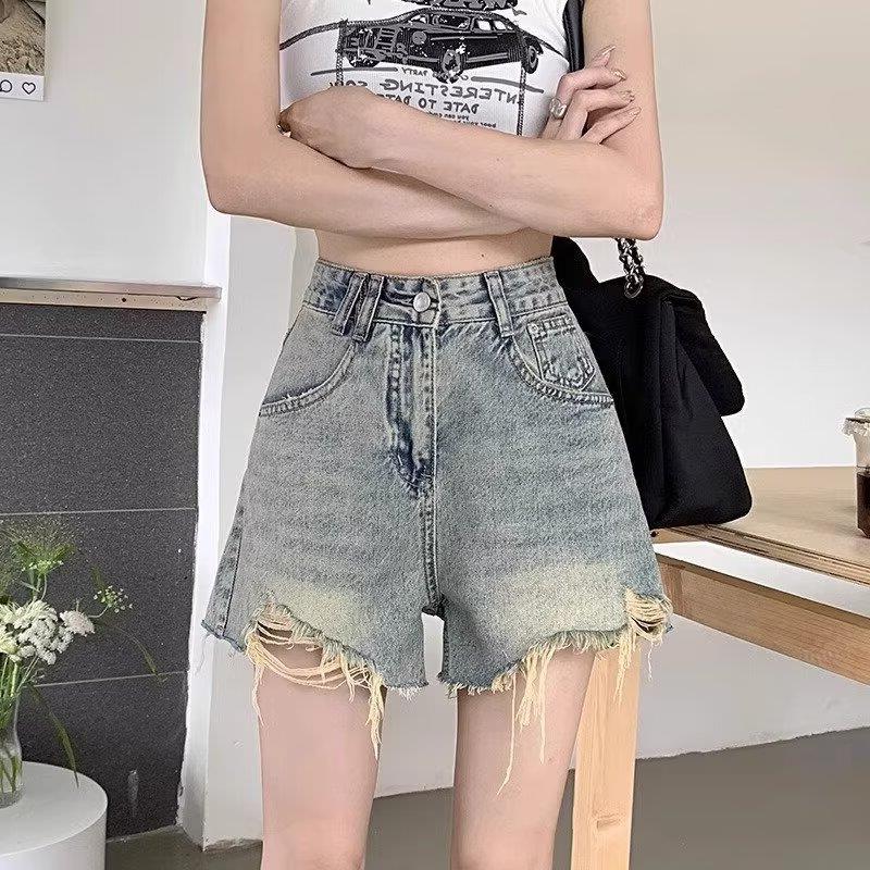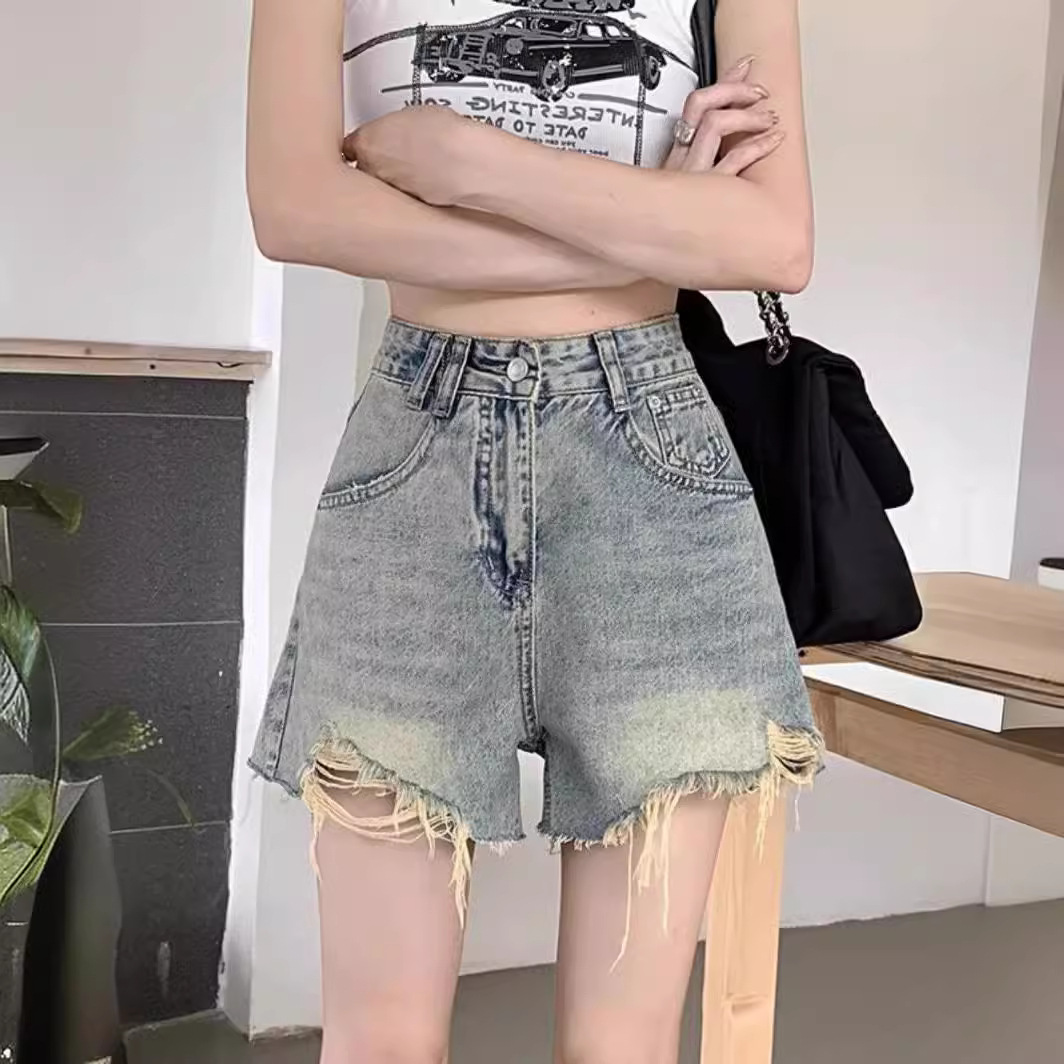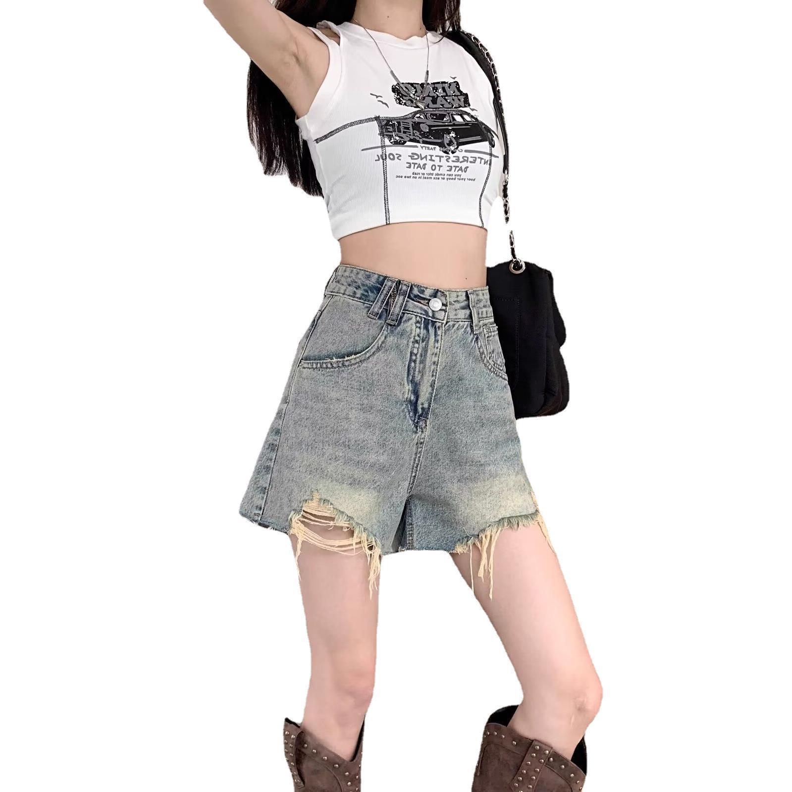 Yellow mud washed distressed Denim high waist shorts women's summer zipper design retro A- line shorts