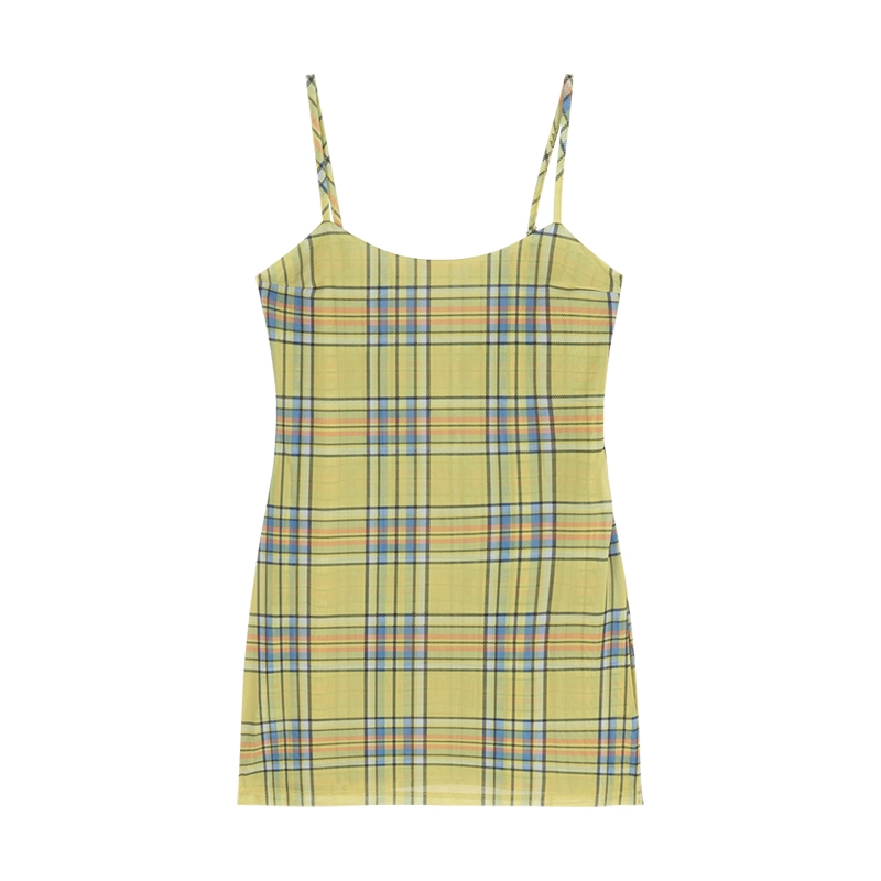 | nameOriginal | Yellow plaid slim fit sleeveless slit backless suspender belt |