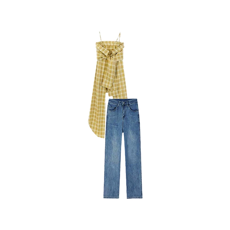 | nameOriginal | Yellow plaid top, jeans, casual and beautiful suspenders |