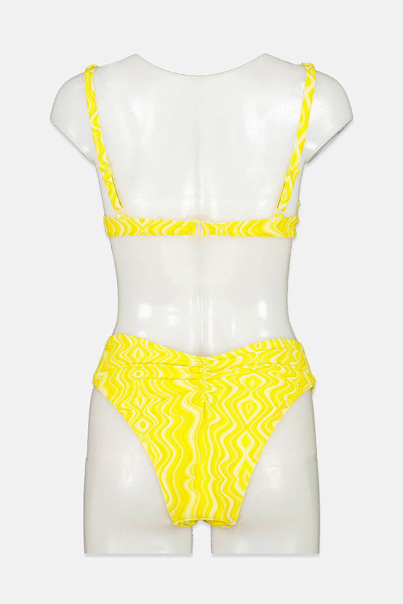 This bikini swimwear is made of 90% Polyester and 10% Elastane fabrics, which are perfect for a day at the beach or pool. The allover print pattern in yellow color family adds a touch of fun to your swimwear collection. Please note that due to hygiene reasons, we do not accept returns on lingerie, socks, undergarments, and swimwear. The size shown is international, and we recommend hand washing for care.