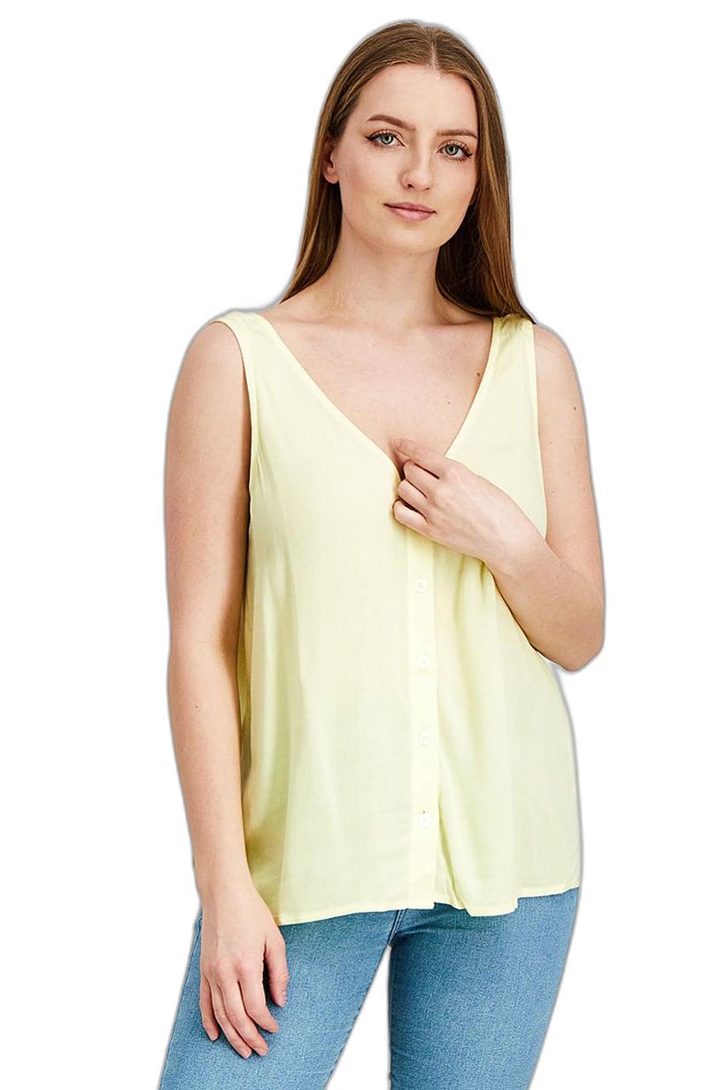 | descriptionOriginal | Care : Machine washable, Fit : Regular fit, Size shown : US, Top Style : Blouse, Types of Hem : High-low hem, Types of Neckline & Collar : V-neckline, Types of Sleeve : Sleeveless, Disclaimer : Product color may slightly vary due to photographic lighting sources or your monitor settings., Fabrics : 100% Viscose, Occasion : Casual, Pattern & Print : Plain/Solid, Types of Closures : Button, Color Family : Yellow, |