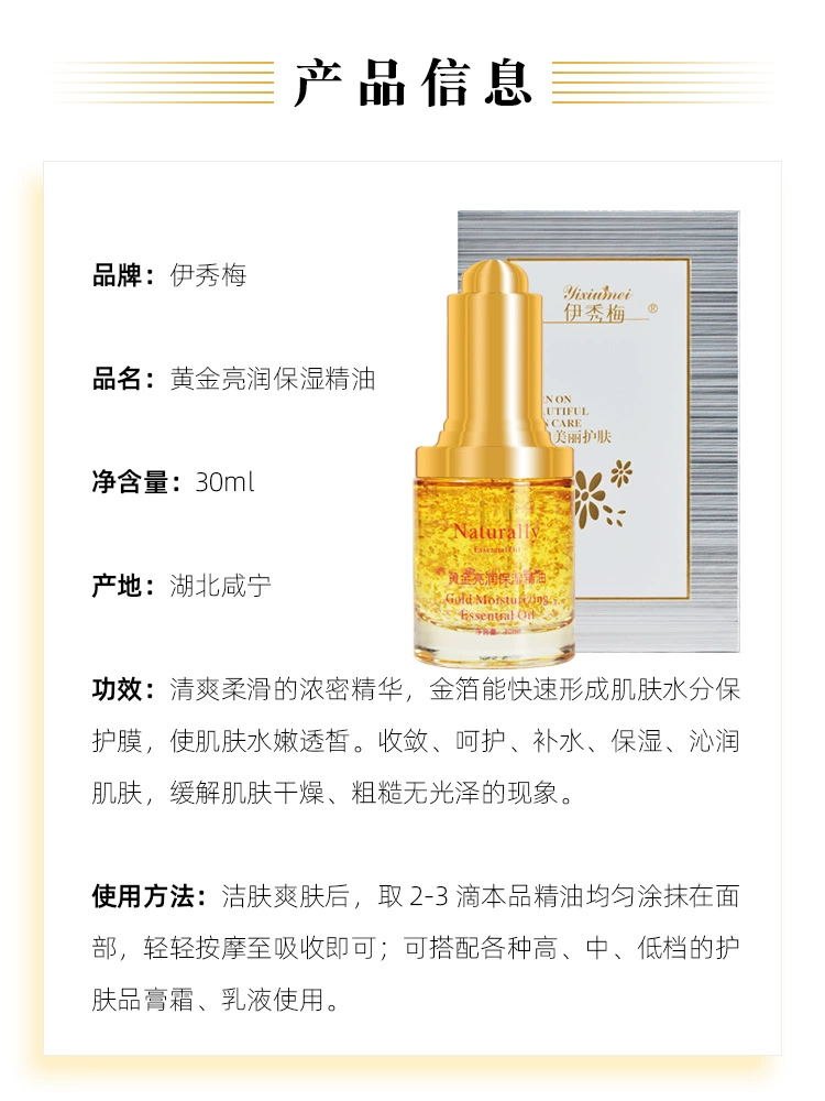 | nameOriginal | Yi Xiumei Eighteen Years Old CC Gold Bright Moisturizing Essential Oil D Genuine Qiao Shiliu Hydrating Essence is tender and translucent |