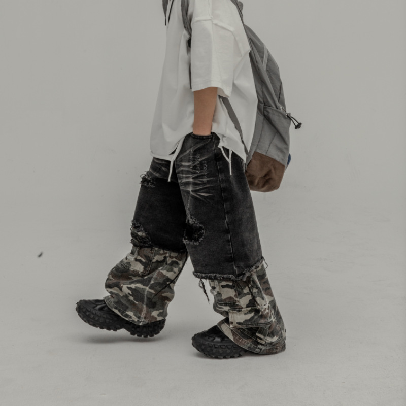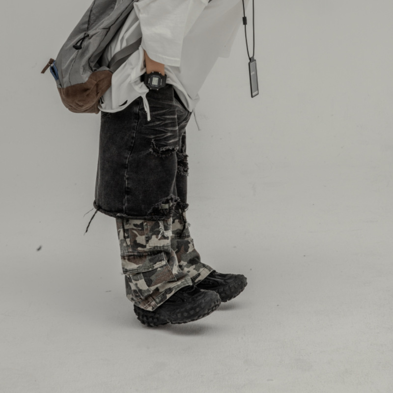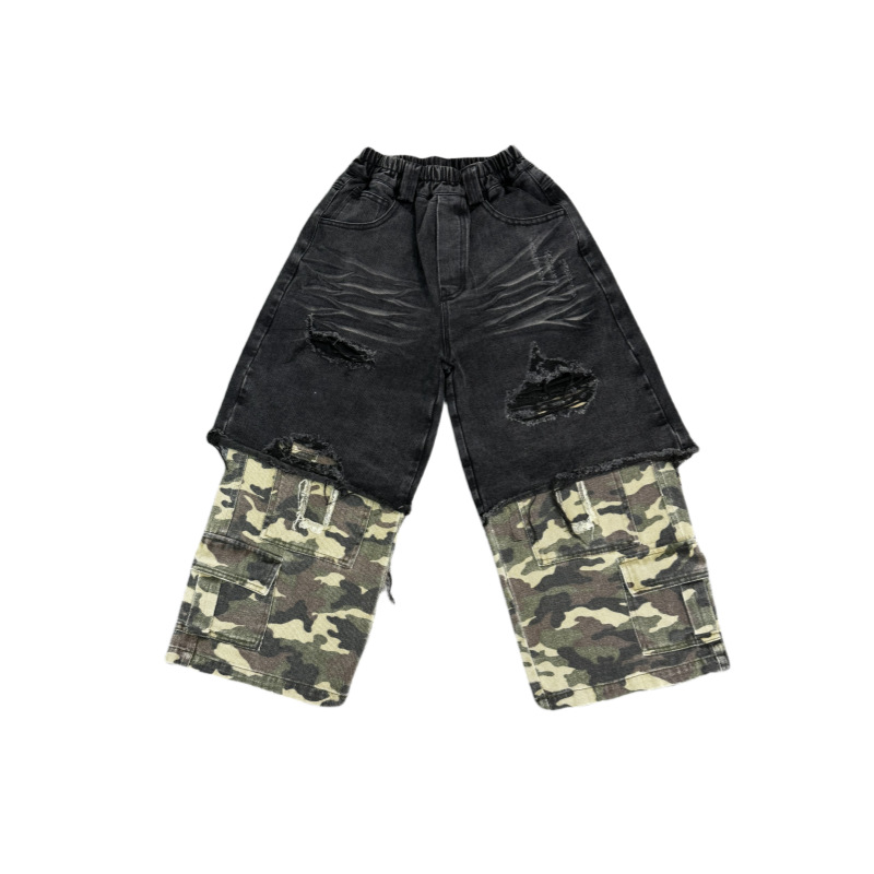Yihong clothing boys’ jeans 2024 Spring Children’s trousers camouflage stitching fake two-piece heavy-duty functional pants