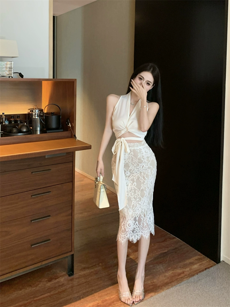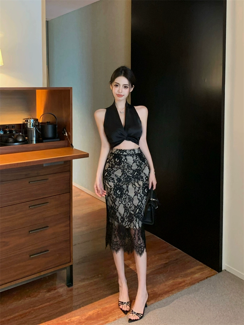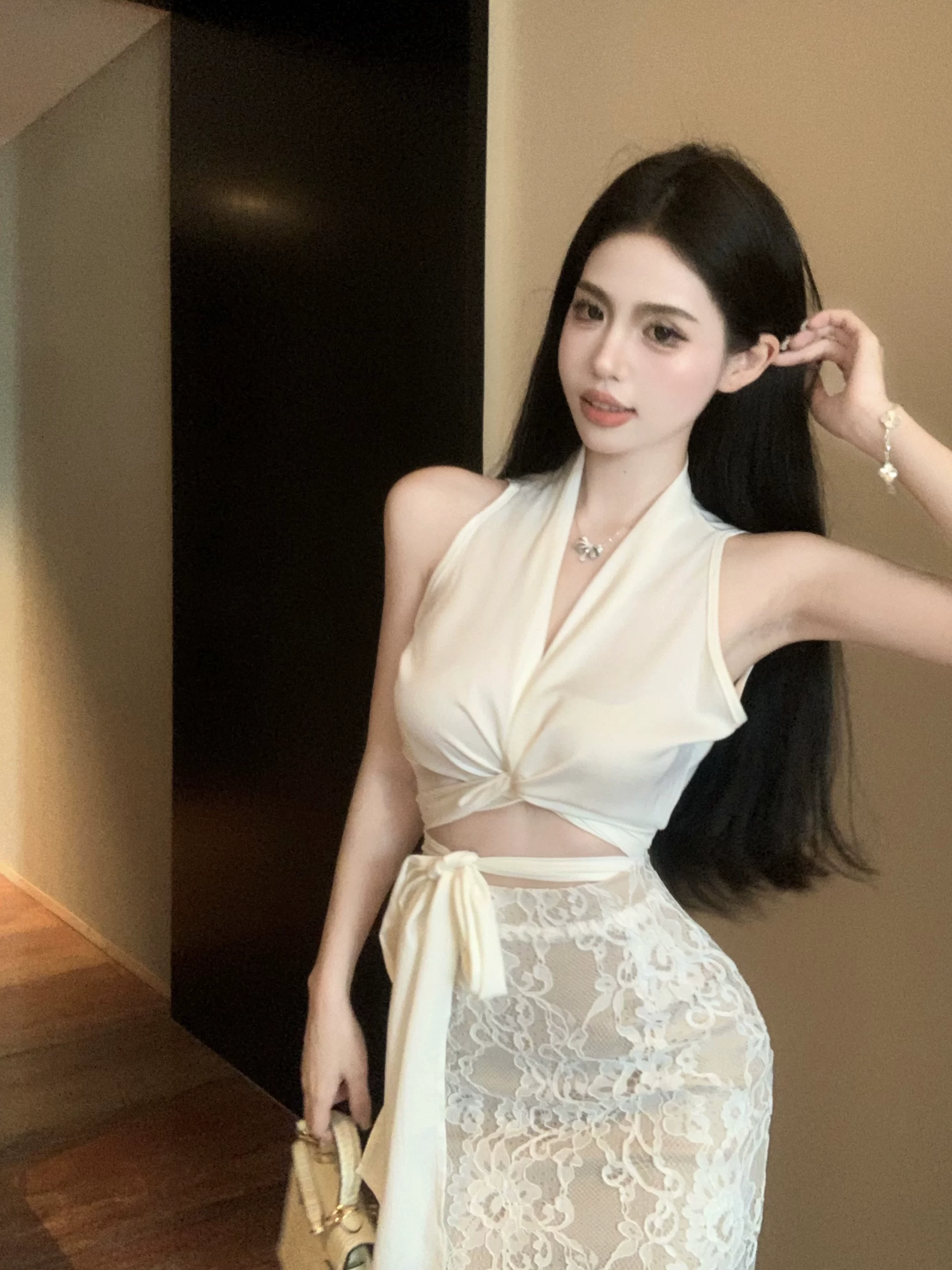 | nameOriginal | Yujie's light mature style lace hip-hugging two-piece halter neck set |