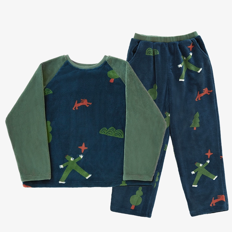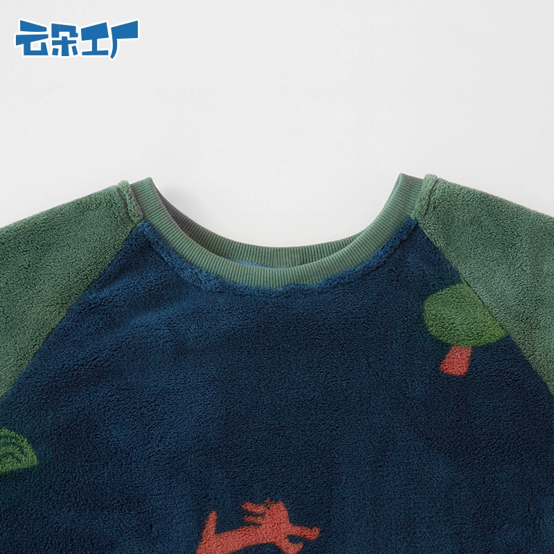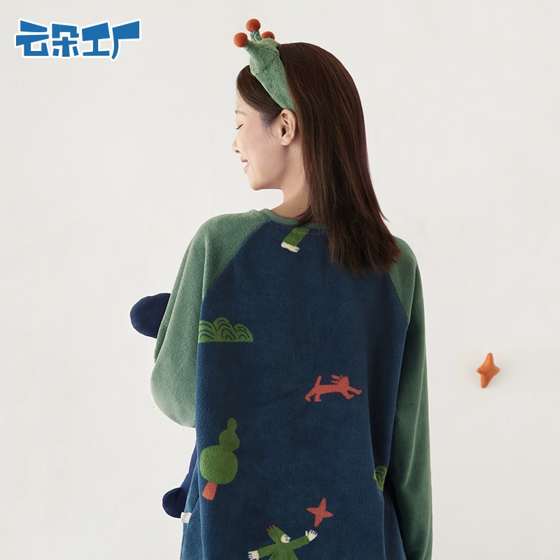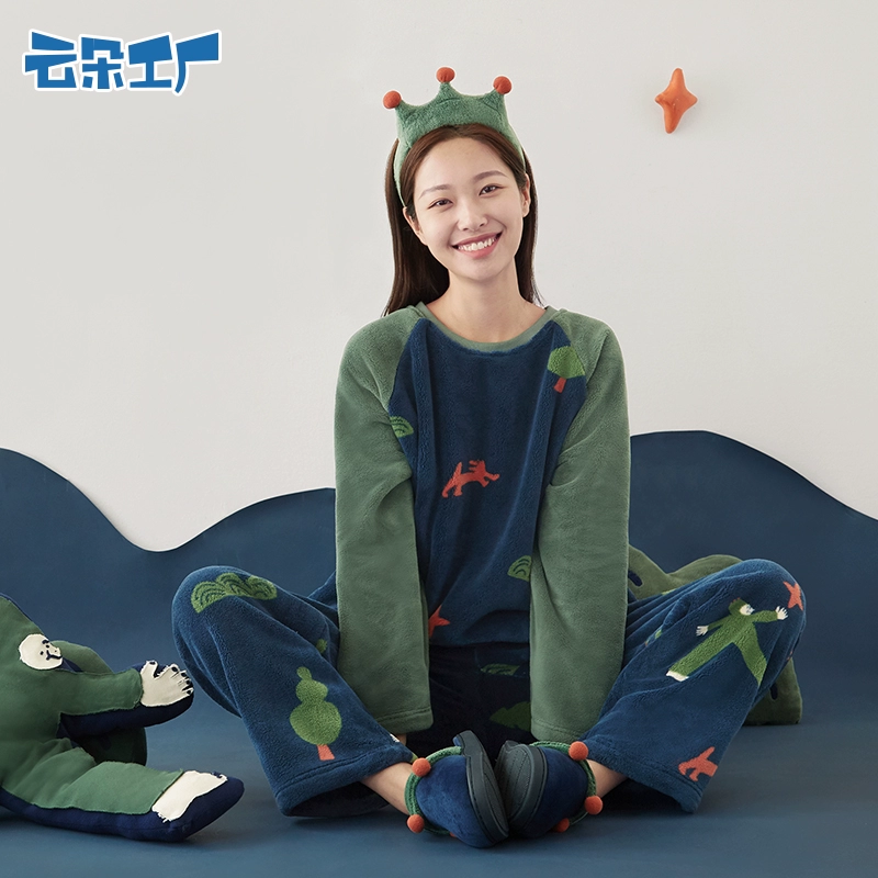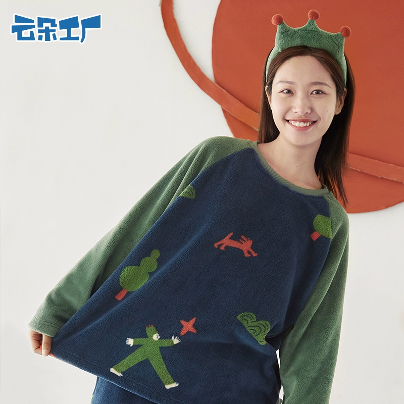 Yunduo Factory Printed Round Neck Lounge Clothes Two-piece Suit Color Blocked Plus Velvet Long Sleeve Warm Pullover Coral Fleece Pajamas