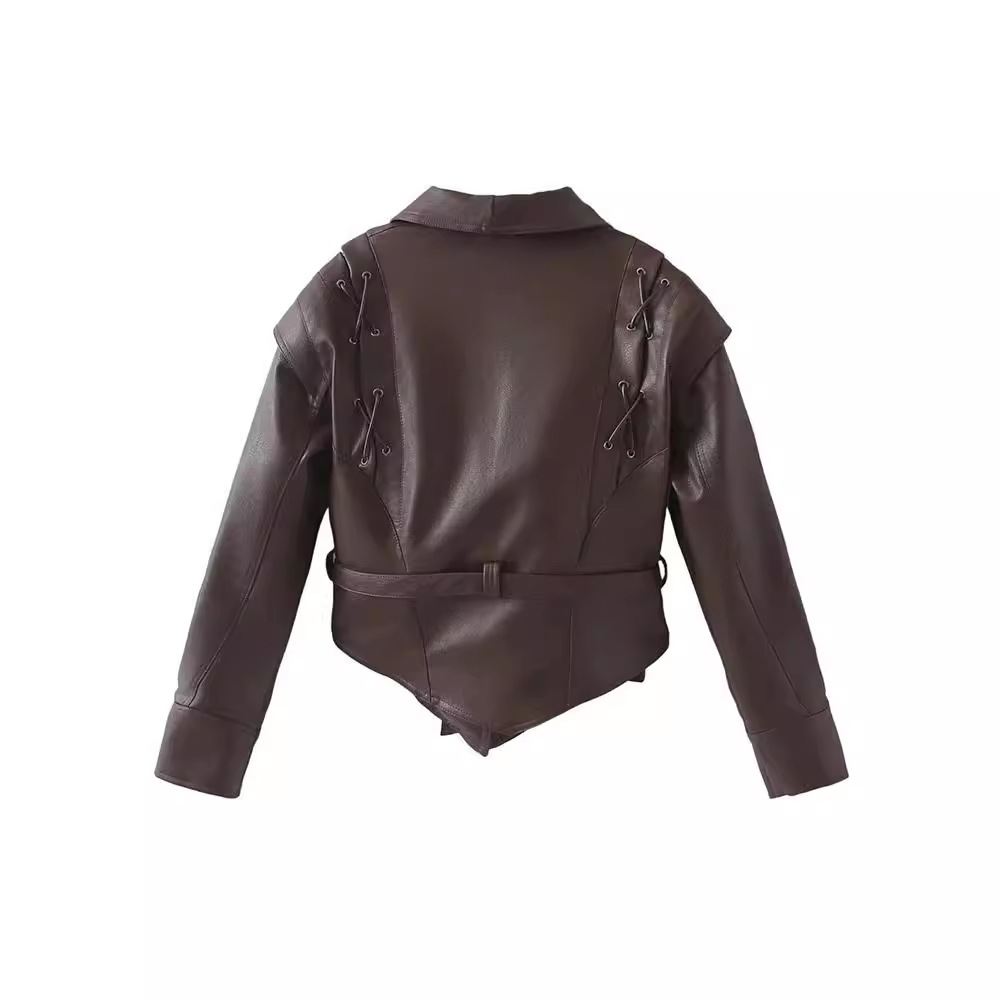 ZADATA Women’s New European and American Style French Fashion All-match Design Retro Coffee Brown Casual Leather Jacket