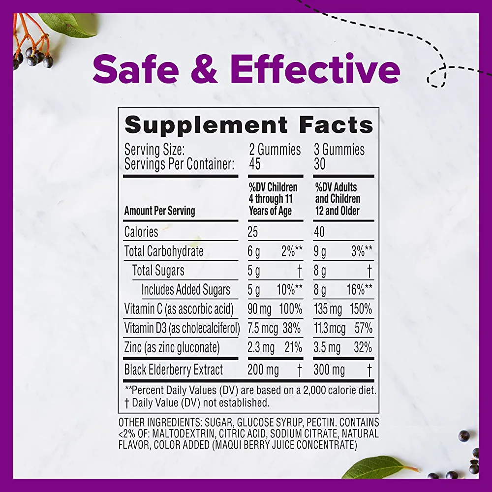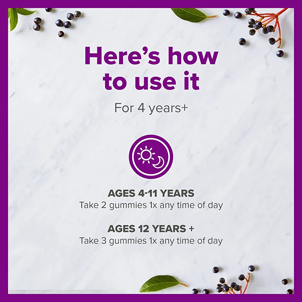 Boost your family’s daily health routine with Zarbee’s Black Elderberry Immune Support* Gummies, which are packed with vitamins C, D & Zinc. These delicious gummies are made from 9,000mg of elderberry for adults and 6,000mg for kids, along with nutrients, antioxidants, & minerals to keep immune systems strong.* Safe for adults and kids ages 4+, these natural berry flavor gummies are easy to chew and can be taken daily. Our gummies are made from carefully selected ingredients inspired by nature and backed by science, and are gelatin-free and vegetarian-friendly. They are also free of drugs, alcohol, artificial sweeteners, and high fructose corn syrup. *These statements have not been evaluated by the Food and Drug Administration. This product is not intended to diagnose, treat, cure, or prevent any disease.