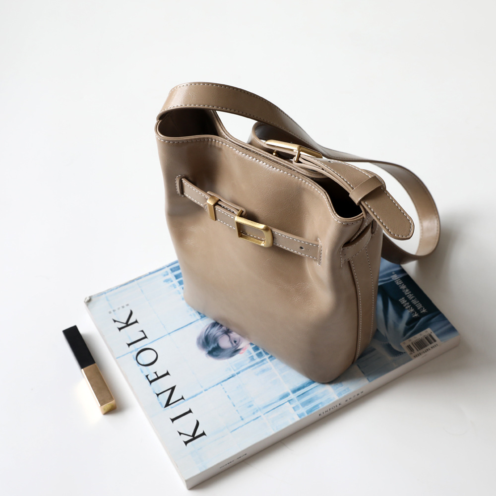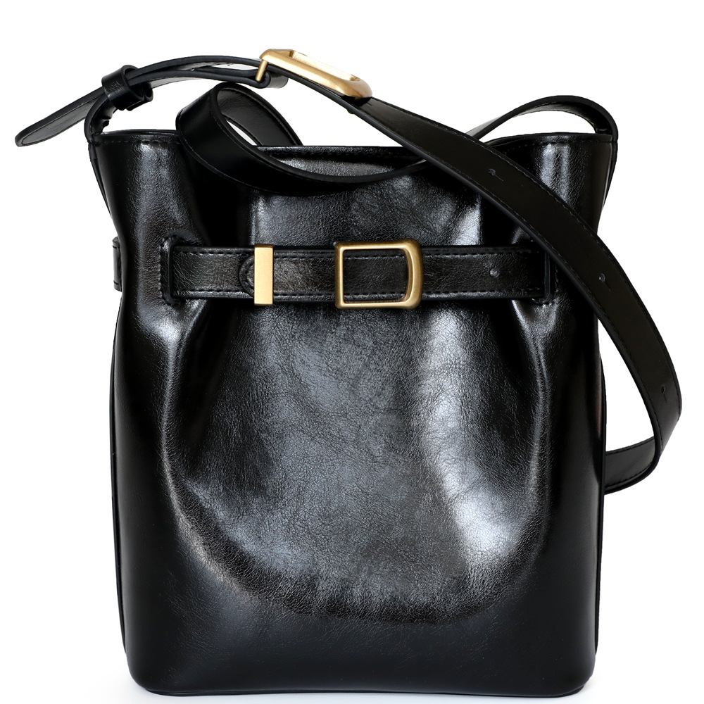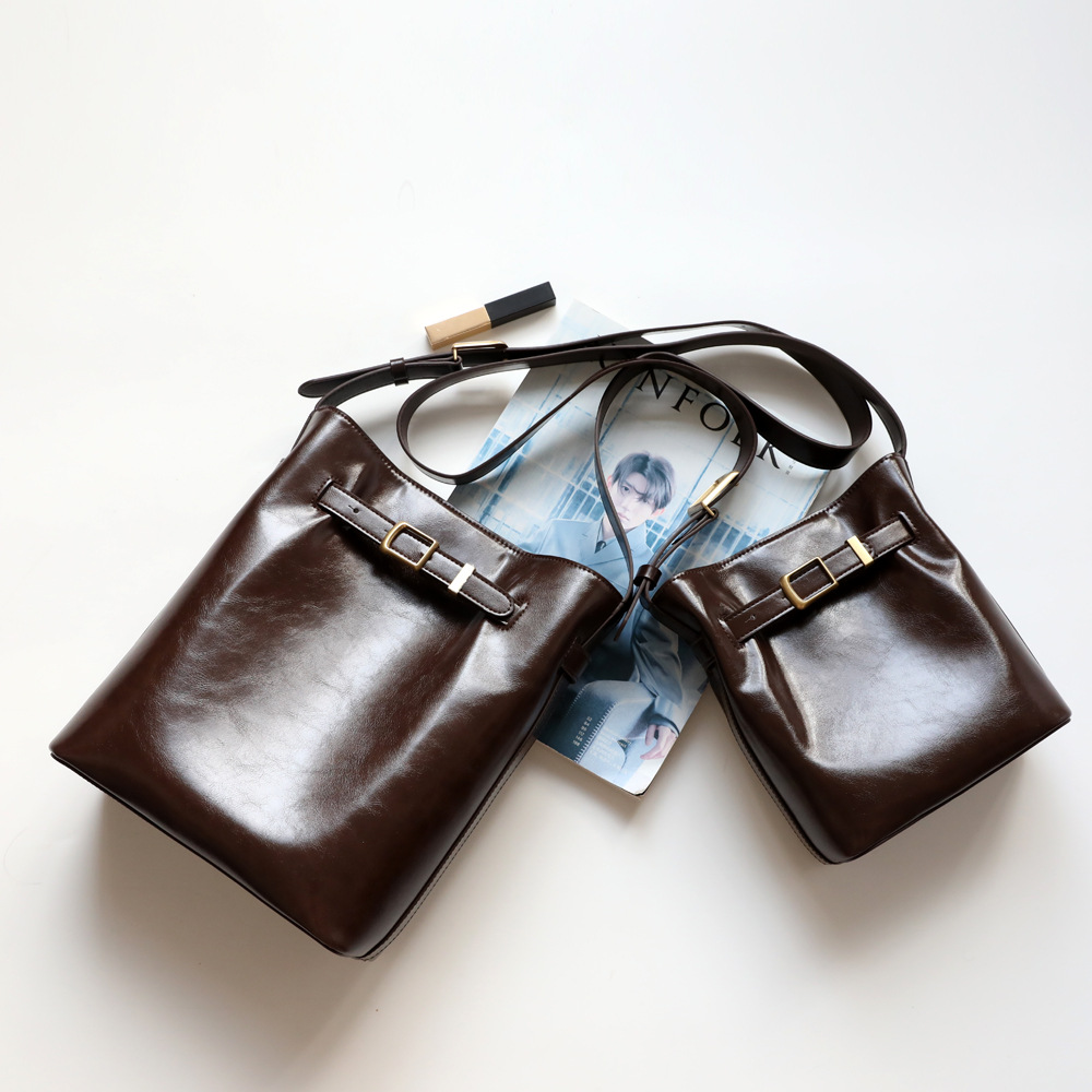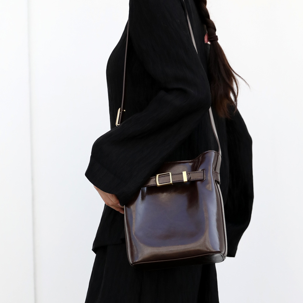 Zheng Liyuan same style oil wax genuine leather autumn and winter women’s crossbody 2023 new retro all-match single shoulder square buckle bucket bag