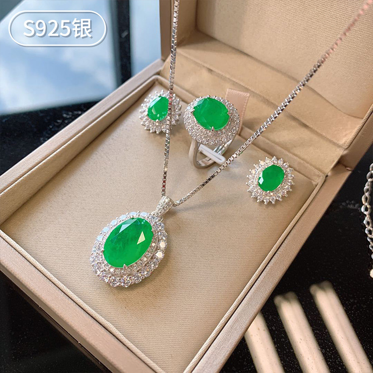 | nameOriginal | Zhuang Sheng jewelry S925 silver jewelry suit classic simulation Emerald Dan-shaped ring stud earrings pendant three-piece set |