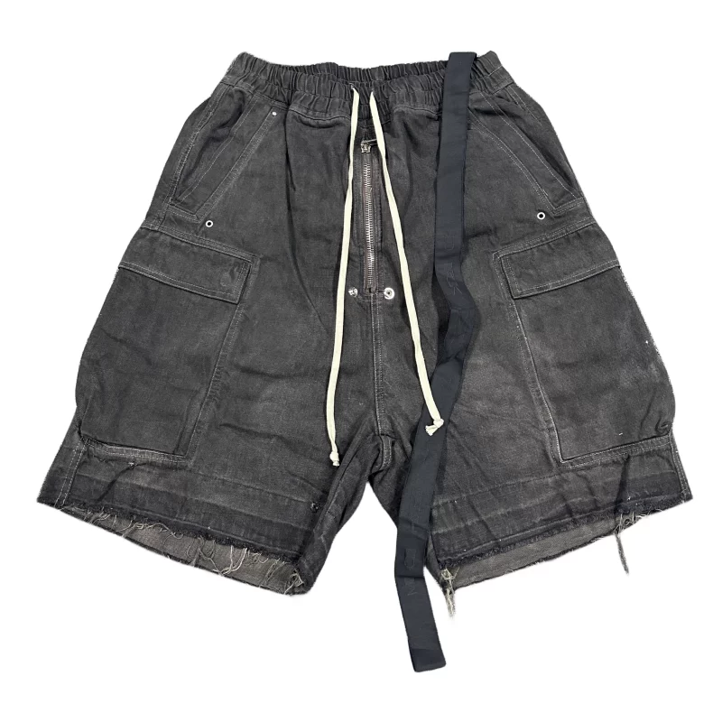 | nameOriginal | Zippered distressed smoky gray raw edge denim shorts overalls |