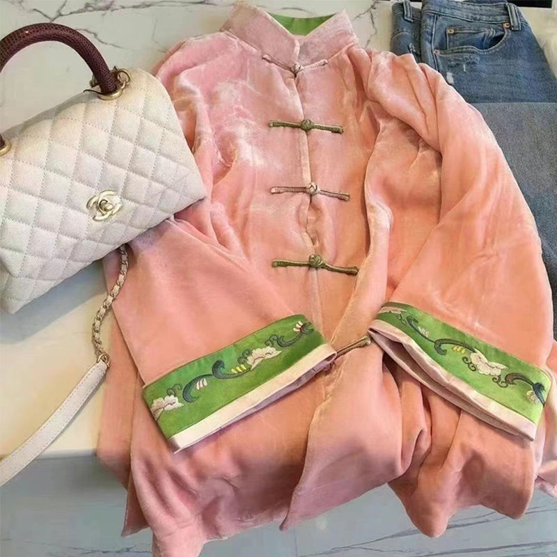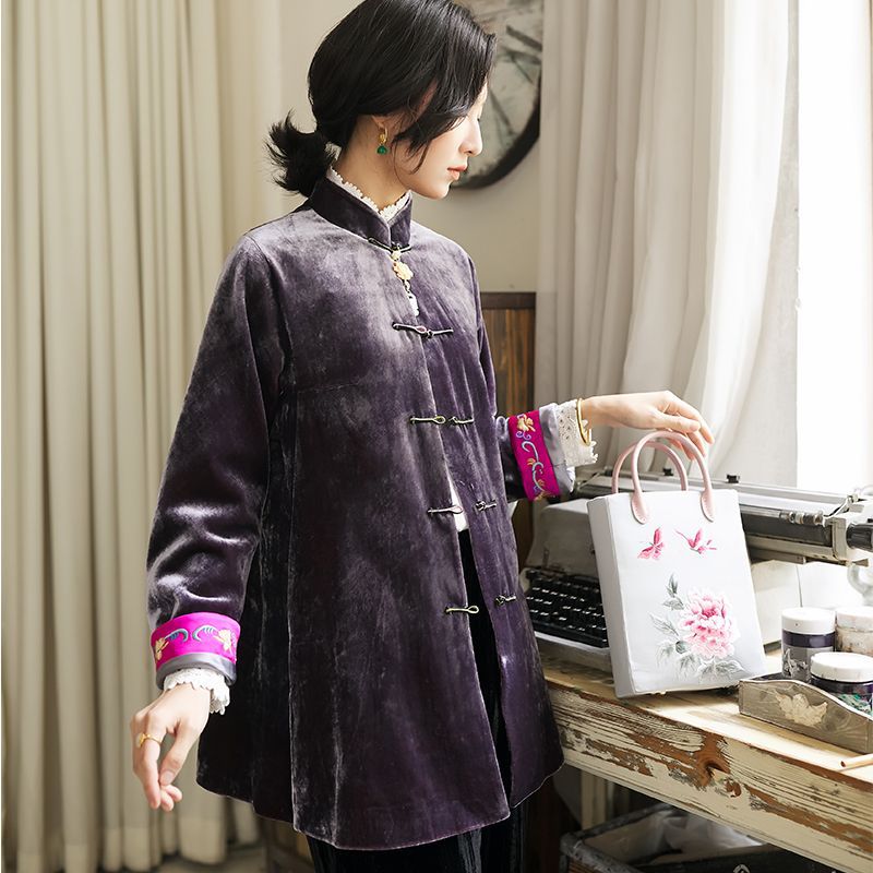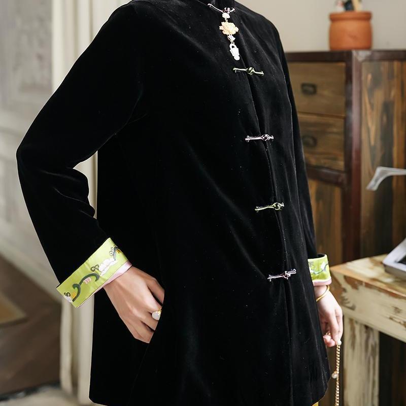 | nameOriginal | Ziyu Silk Language Autumn and Winter New Chinese Style Heavy Industry Embroidery Stand-cut Velvet New Chinese Style One-word Button Coat Top |