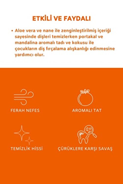 Thanks to its content enriched with aloe vera and mint, it helps children to acquire the habit of brushing teeth with the taste and smell of orange and tangerine flavor when cleaning teeth.