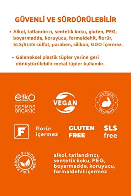 Usage: Brush your teeth twice a day or as often and as recommended by your dentist. It is not recommended to use toothpaste in infancy and children up to 3 years of age. In order to prevent swallowing in children 6 years and younger, it should be rubbed on the brush the size of chickpeas. Do not swallow. After brushing, it should be spitted, and the mouth should be rinsed with plenty of water. Store from 5 °C to 25 °C, away from sunlight. Featured Herbal Ingredients: Aloe Vera: It has anti-inflammatory and anti-microbial properties, which helps prevent tooth decay by killing bacteria that cause plaque formation. Mint: removes bad bacteria in the mouth and helps to remove bad breath. It also has antiseptic and anti-bacterial properties. Tangerine: Known for its pain relieving properties, tangerine is highly effective in removing the negativity caused by toothaches and oral sores. It also has anti-bacterial property, helps prevent tooth caries and fractures by preventing bacteria from multiplying. Orange: Since it has antiseptic properties, it prevents germs and bacteria from living and spreading. In this regard, it is especially effective in the healing of mouth and throat wounds. Contents: Glycerin, Aloe Barbadensis Leaf Juice*, Hydrated Silica, Aqua, Xanthan gum, Lauryl Glucoside, Citrus Aurantium Dulcis Peel Oil*, Expressed, Citrus Reticulata Peel Oil*, Mentha Piperita Oil*, Citral, Limonene, Linalool *Organic farming content% 100% natural content, 30.5% organic content.
