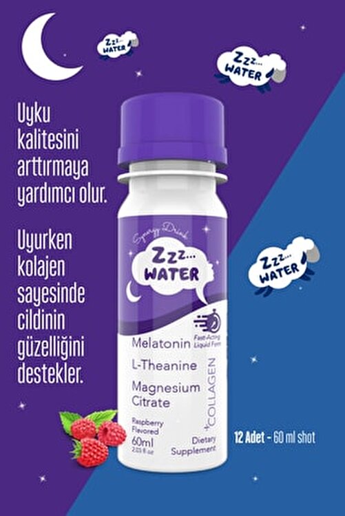 12 Pieces 60 Ml Shot contains Melatonin and Collagen. Beauty Sleep Zzz Water is an excellent support for adults who have trouble getting a good night's sleep. The natural Raspberry flavored form works together with Melatonin, L-Theanin and Magnesium Citrate to promote relaxation and calm, while also supporting skin beauty with the Collagen it contains, with a unique formula that makes it easy to fall asleep and stay asleep with you! Zzz Water is easy to use – you just need to drink a bottle about 30minutes before bedtime. Thanks to its disposable form, you can carry it with you at any time and use it as you wish on trips, long flights and journeys as you wish with the anti-Jet Lag effect. Unlike other sleeping vitamins, Zzz Water does not habit and does not make you feel sluggish or hangover in the morning. With Zzz Water you can enjoy a good night's sleep and wake up feeling refreshed and ready for the day. Try Zzz Water today and see how it can help you get the sleep you need!